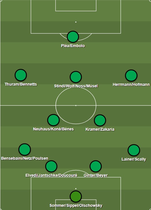 Como o torcedor já está habituado, os Potros devem atuar no 4-2-3-1, formado por Sommer, Lainer, Ginter, Elvedi, Bensebaini; Kramer, Neuhaus; Hofmann, Stindl, Thuram e Pléa.