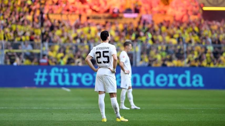 Dentro de vinte minutos de partida, o Gladbach já perdia por 3 a 0 e uma derrota humilhante era esperada. Malen abriu o placar logo aos 5’, aproveitando chute desviado de Haller. Com dois gols em sequência, os aurinegros aumentaram a vantagem – Bellingham, de pênalti e Haller, de letra, foram as redes aos 18’ e 20’.